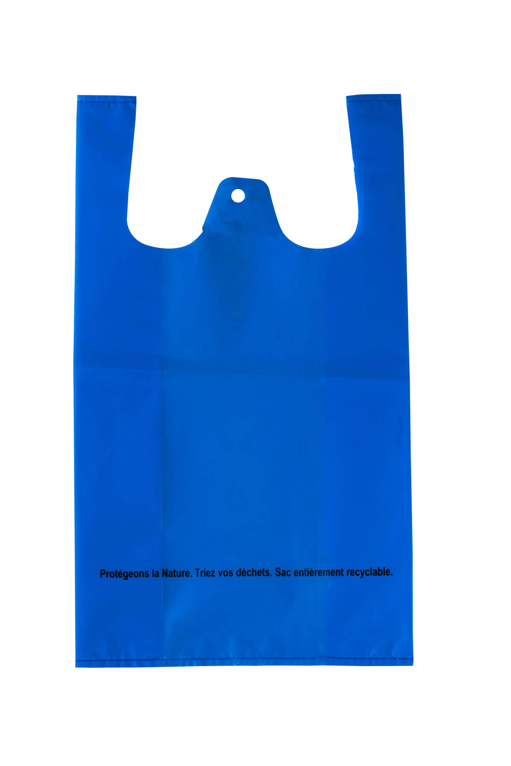 Sacs bretelles bleu en 50 microns conforme à la loi de transition énergétique .